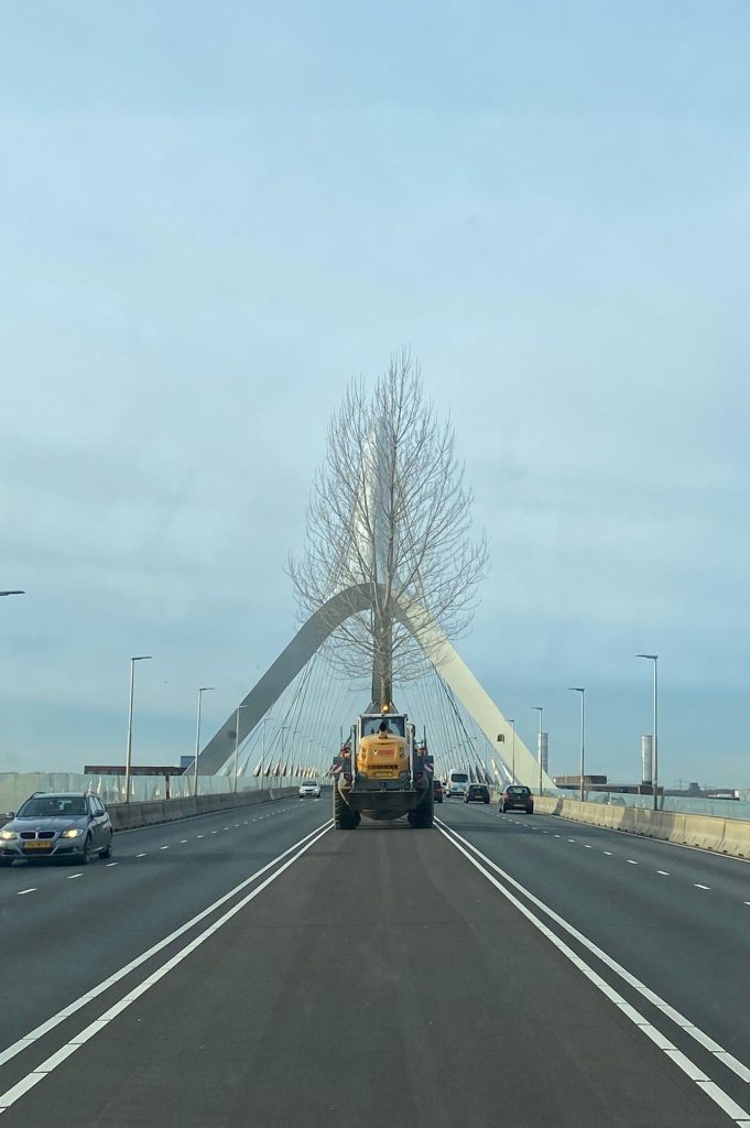 Je zal maar rustig in je auto zitten, komt er in een keer zo’n grote machine met reuzenboom langs!