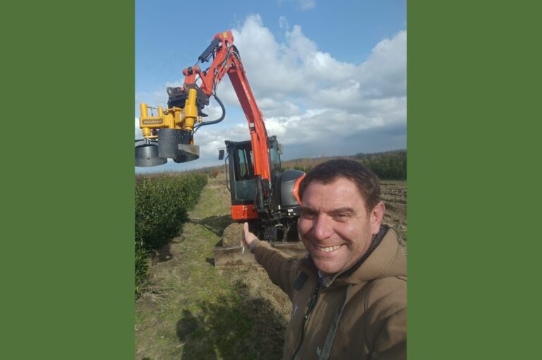 Een lentezonnetje op je bol… fijn Prunus rooien met een Kubota minigraver en de Damcon KLR-300M ST.